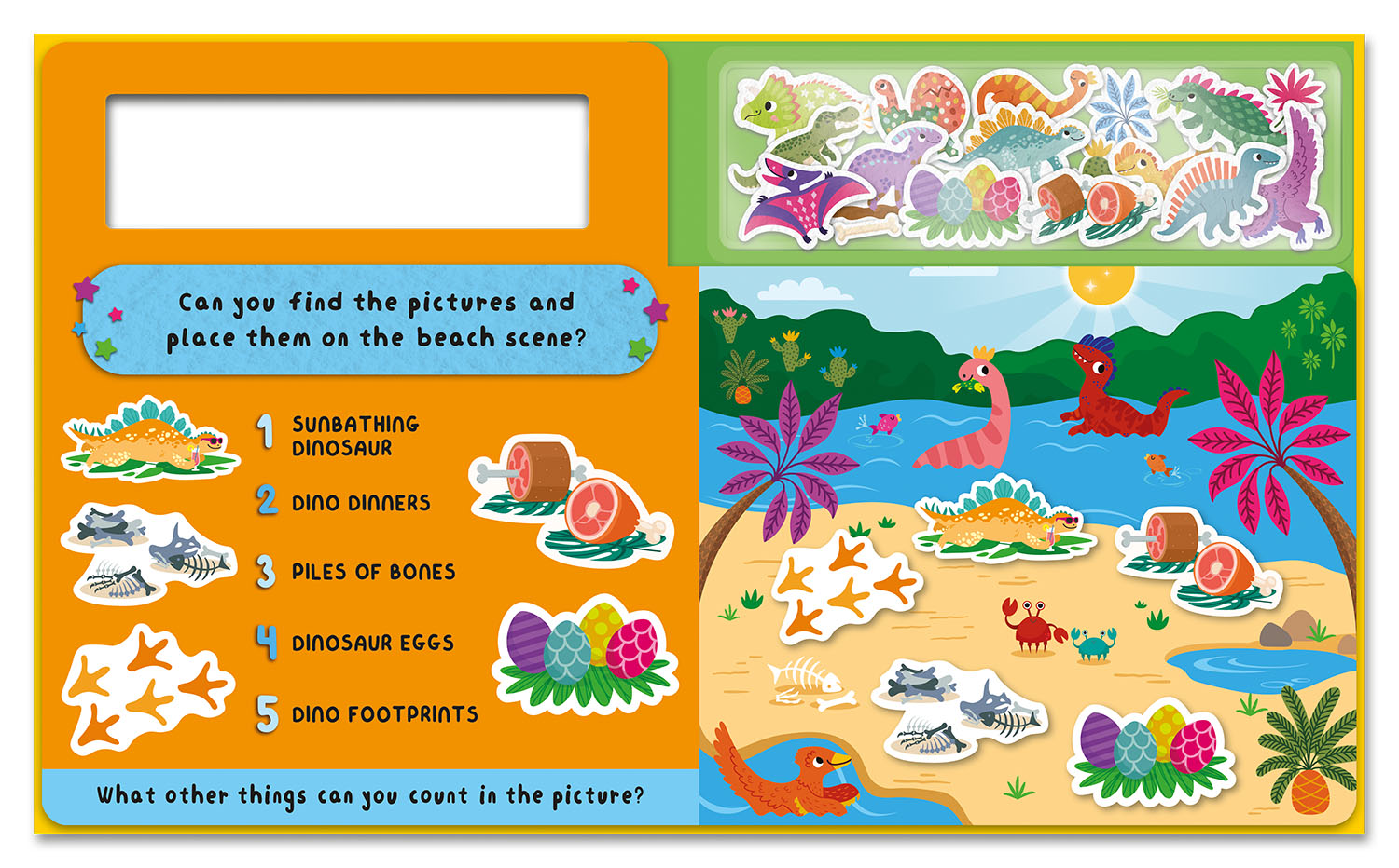 Learn and play with 5 scenes and 28 soft felt pieces. With counting, shapes, colours and sounds to discover, you will have lots of first learning fun while bringing each dinosaur scene to life.