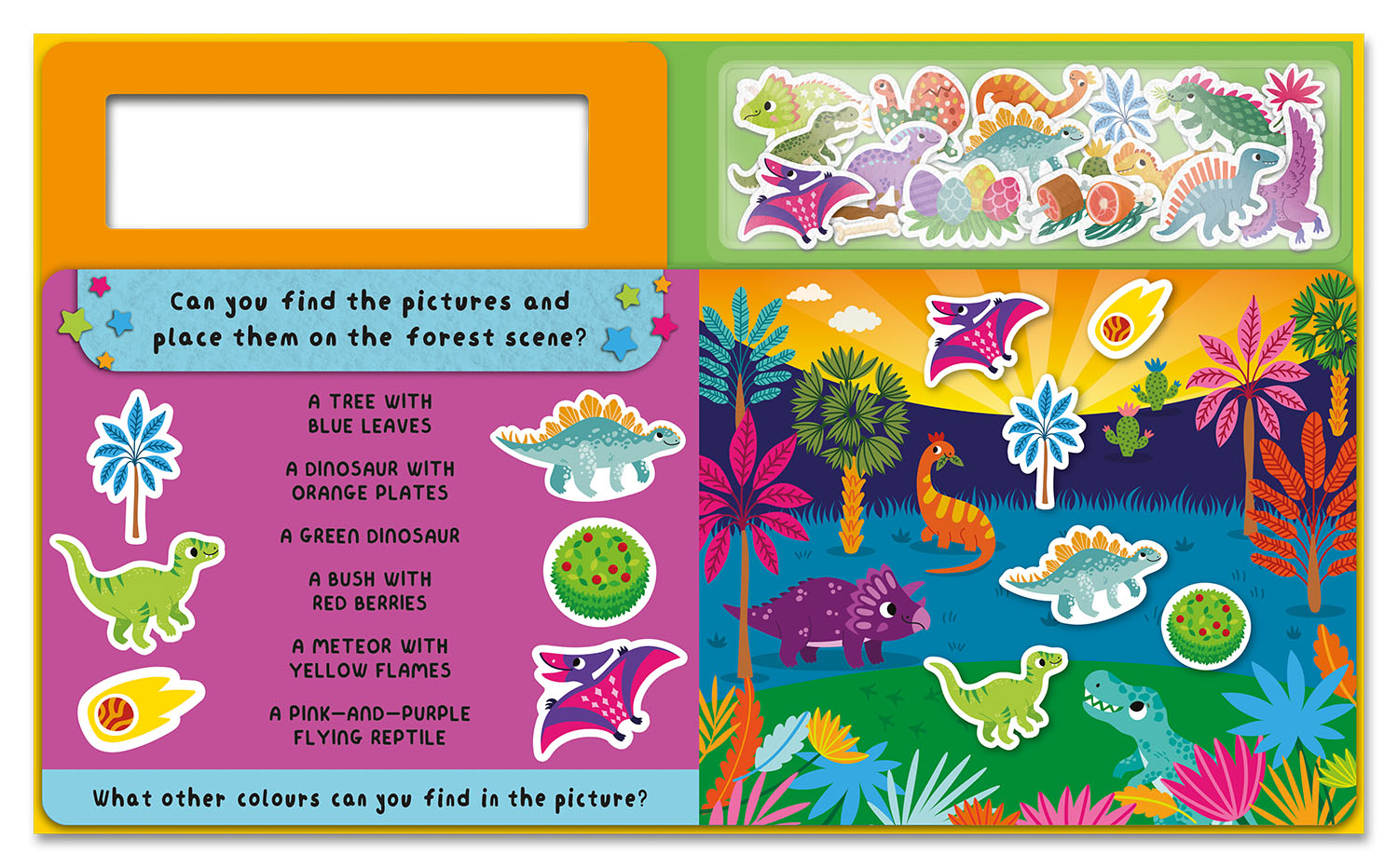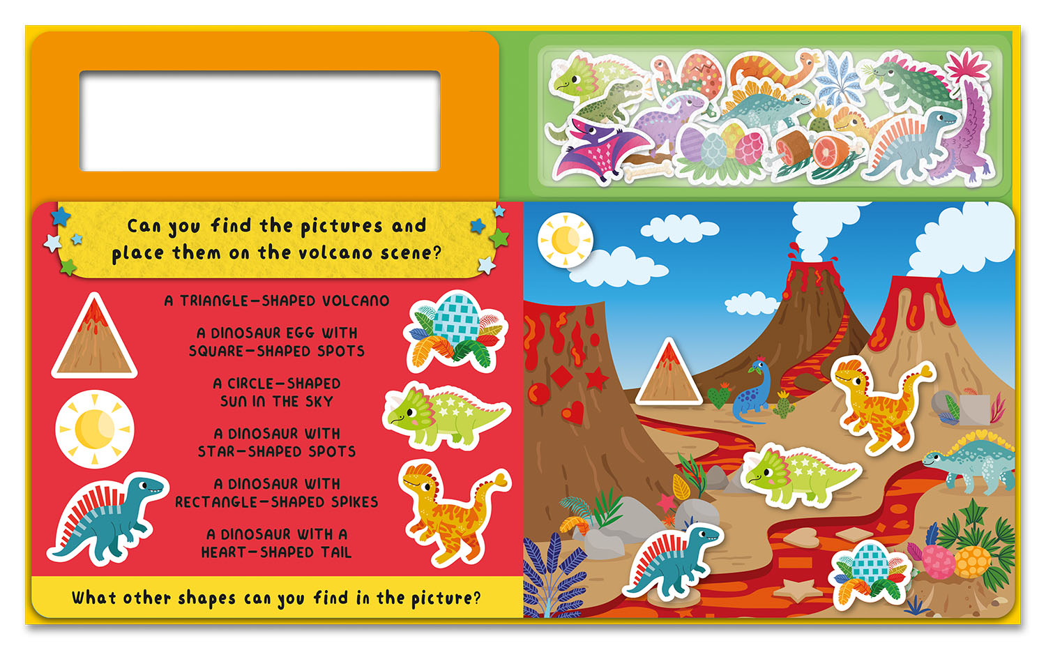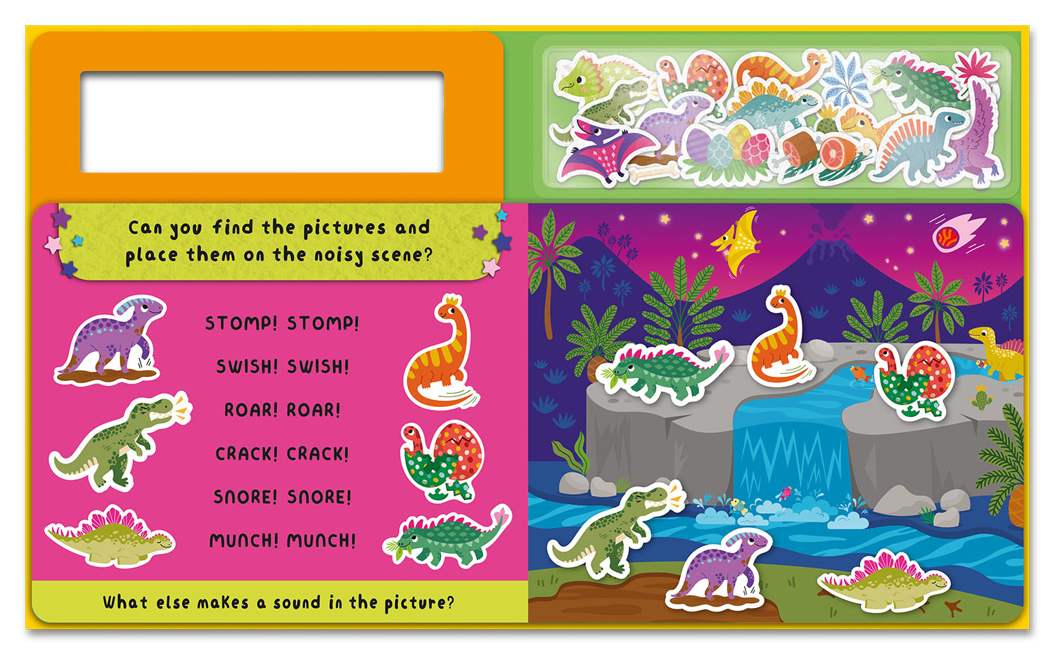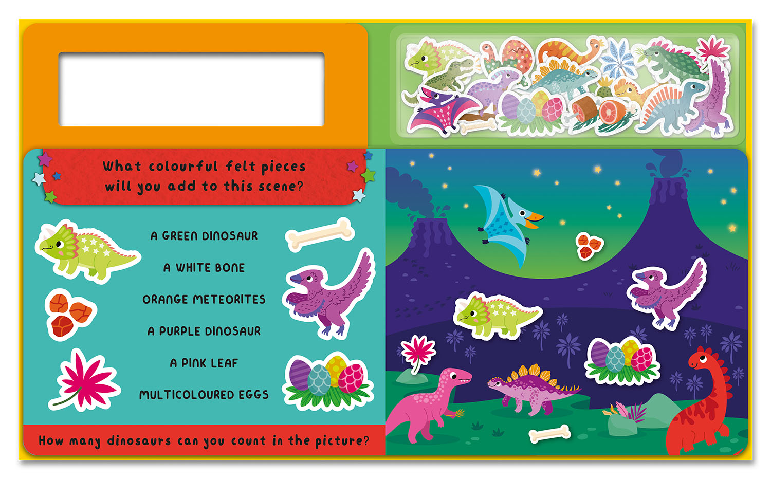From a sparkling midnight waterfall to a mega-hot volcanic desert, every scene is packed with dino-mite fun! Match the felt pieces to their perfect spots and imagine the T. rex stomping through the jungle, the Triceratops grazing by the waterfall and a giant volcano exploding. Each page is filled with exciting descriptions to spark young imaginations and guide their storytelling.