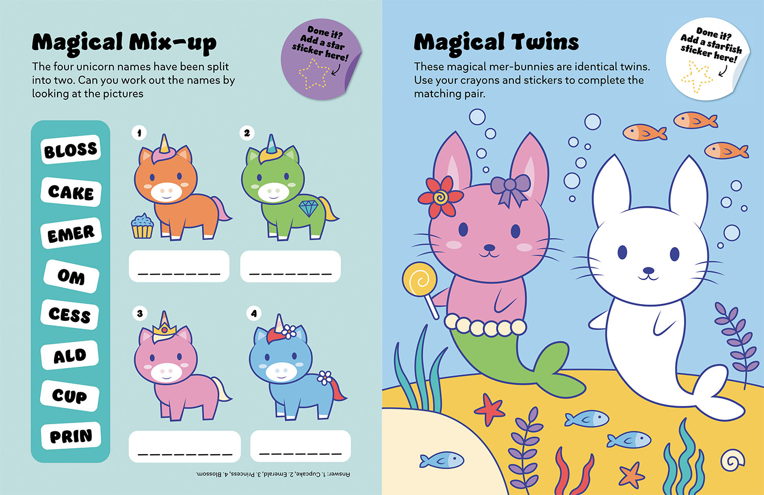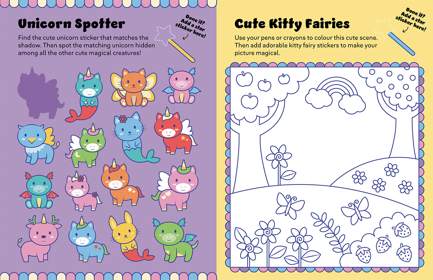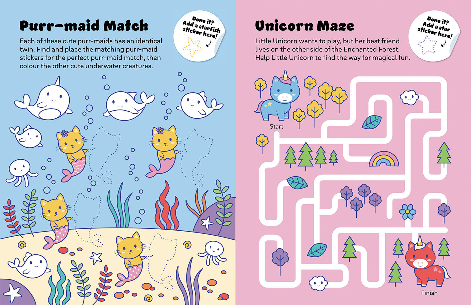 Inside, kids will find spot-the-difference challenges, mazes, word searches and more, all designed for hours of super-cute fun. Use the stickers to complete the activities or decorate your notebooks, folders and favourite things with extra cuteness.
