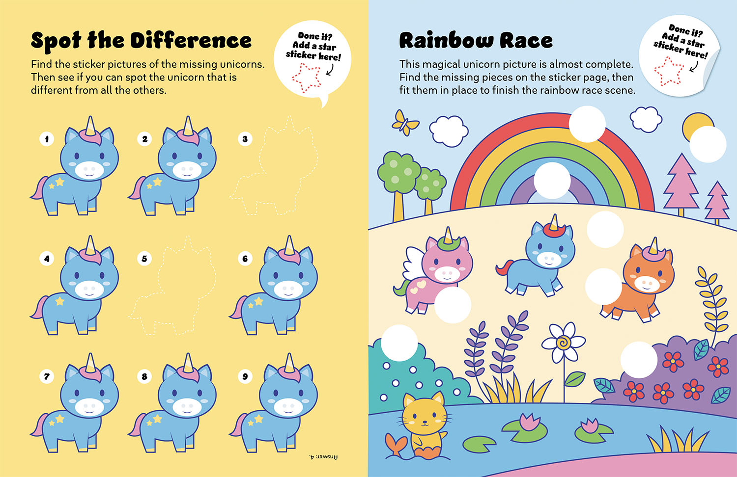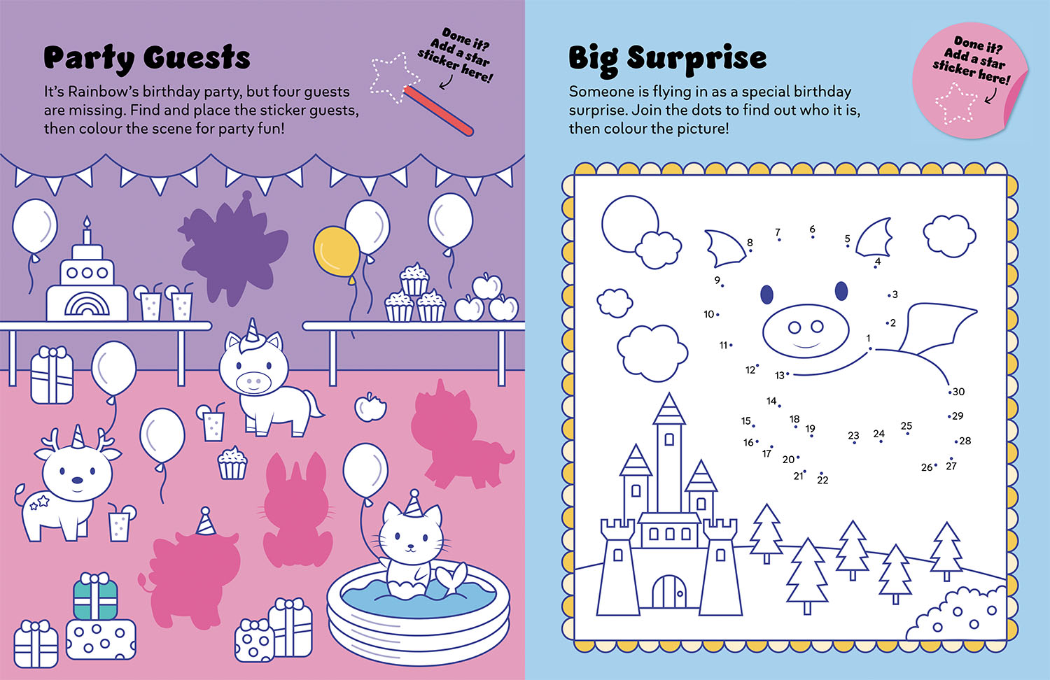 This adorable unicorn-themed sticker activity book is packed with 150 colourful stickers, fun puzzles and special foil stickers to make your creations shine!